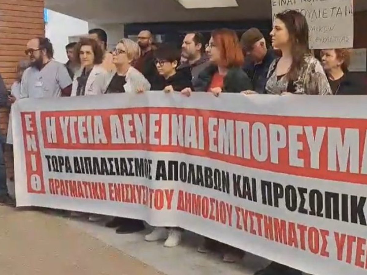Διαμαρτυρία γιατρών στο Παπαγεωργίου ενόψει επίσκεψης Γεωργιάδη για τα εγκαίνια της νέας ογκολογικής πτέρυγας.