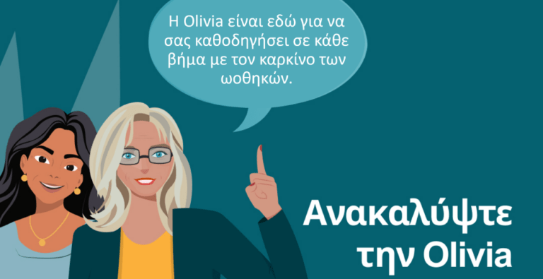 Σημειώνεται ότι οι πληροφορίες που παρέχονται μέσω του ψηφιακού εργαλείου Olivia έχουν αποκλειστικά ενημερωτικό χαρακτήρα και δεν υποκαθιστούν την ιατρική συμβουλή. Οι ασθενείς θα πρέπει να απευθύνονται στον θεράποντα ιατρό τους για εξατομικευμένη καθοδήγηση και λήψη αποφάσεων σχετικά με τη θεραπεία και τη φροντίδα τους.