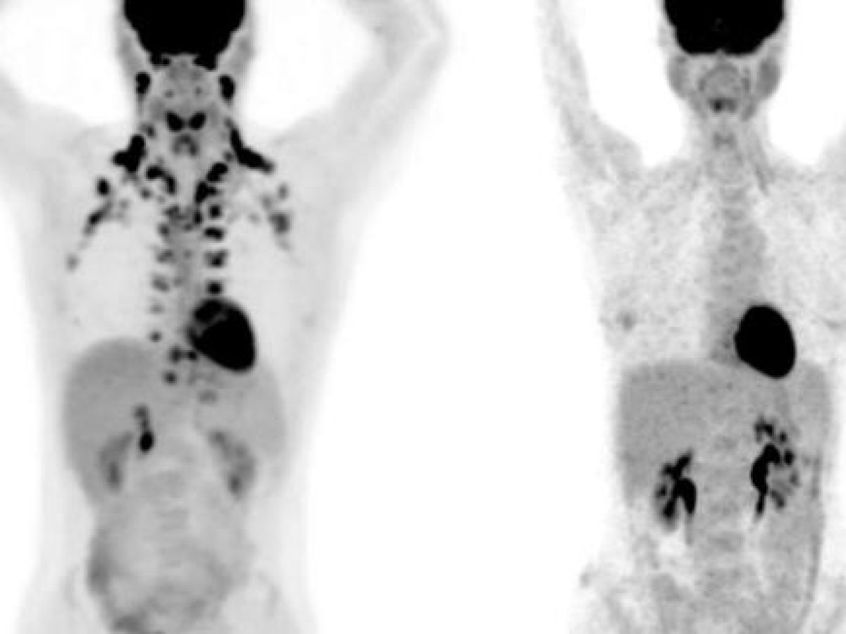 Σε αυτές τις εξετάσεις PET, το άτομο στα αριστερά έχει άφθονο καφέ λίπος γύρω από τον λαιμό και την αυχενική μοίρα της σπονδυλικής στήλης. Το άτομο στα δεξιά δεν έχει ανιχνεύσιμο καφέ λίπος.